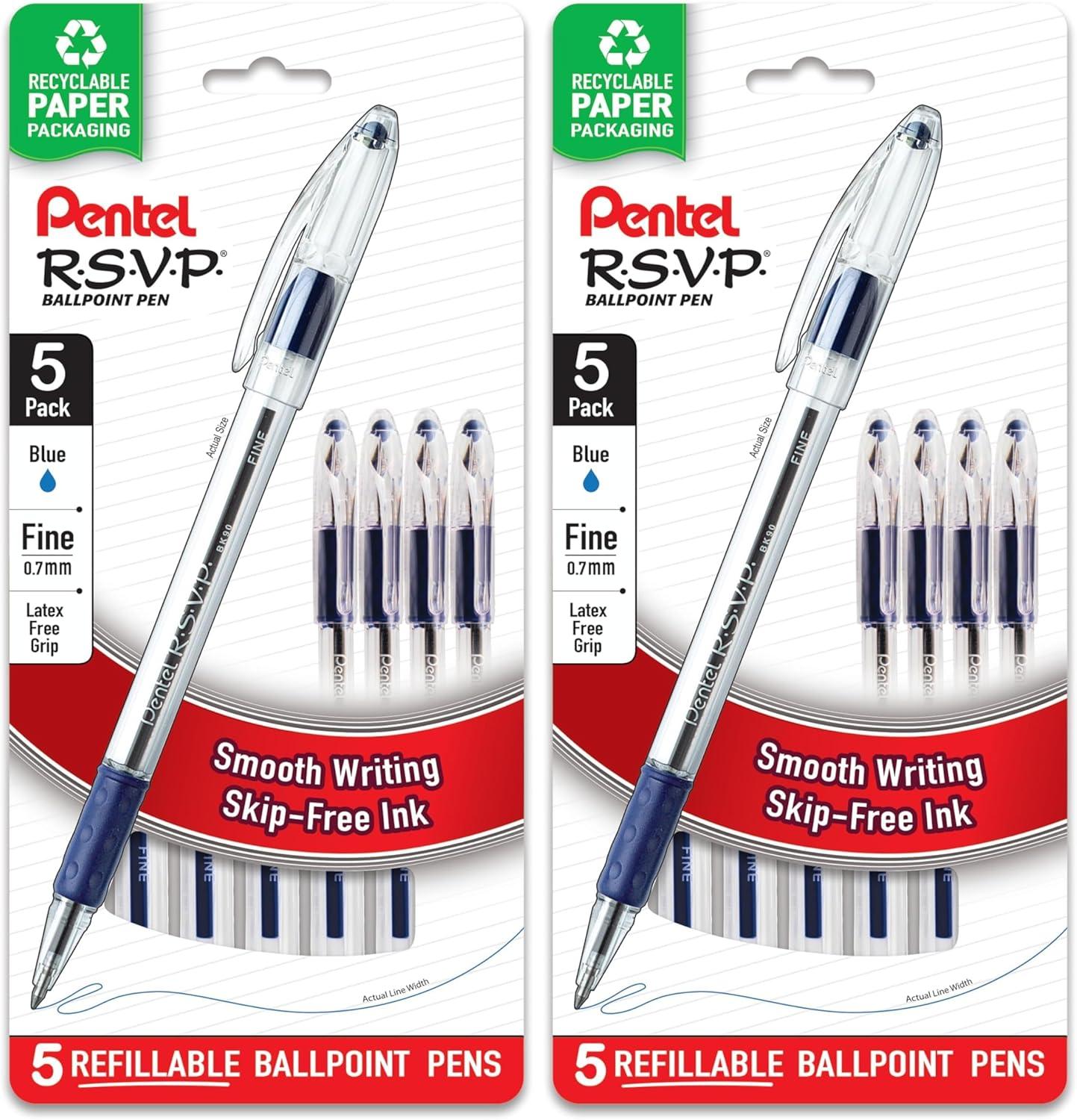 Pentel 474028 R.S.V.P. Ballpoint Pens Fine Point Assorted Ink 5 Pack (BK90BP5M)(Blue)