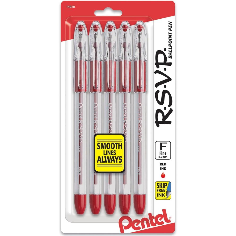 Pentel 474028 R.S.V.P. Ballpoint Pens Fine Point Assorted Ink 5 Pack (BK90BP5M)(Red)