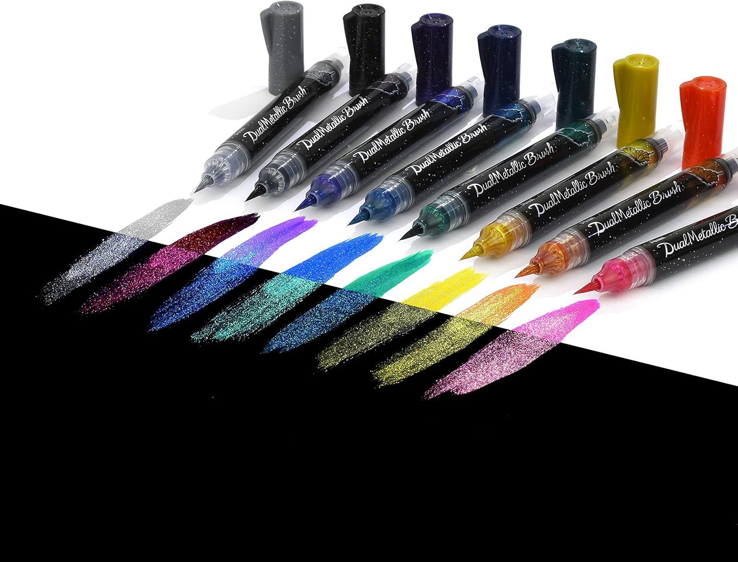 A new innovative art brush with iridescent ink. Each pen includes 2 different colors when writing on white and black paper. The nylon brush tip holds up after repeated use, and a plunger on the top of the pen ensures the pen always has bold lines.