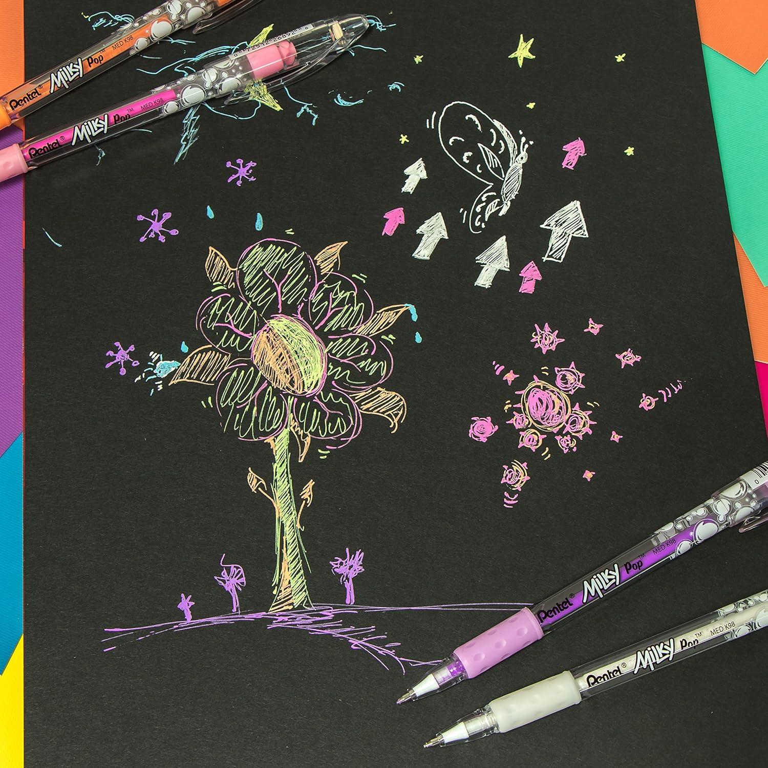 The Pentel Milky Pop gel pens add a “POP beauty” of color to any page. Milky pastel colors work on light or dark colored paper to make your writing and artwork stand out. Smooth gel ink and extra-long balanced barrel for effortless writing and control. Latex-free grip for comfortable writing and drawing. 0. 8mm metal tip writes medium lines. Ap certified. Backed by a limited lifetime.