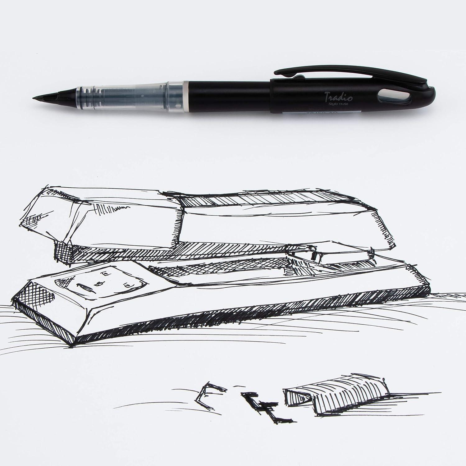 The Pentel Arts Tradio sketch pen offers a flexible nib creates a variety of line widths, from thick to thin, depending on the angle and pressure applied. Rich water-based dye ink dries quickly for sketching and drawing. Ink glides effortlessly across paper with the free-flow liquid ink system. Distinctive barrel design stands out in any artist's collection.