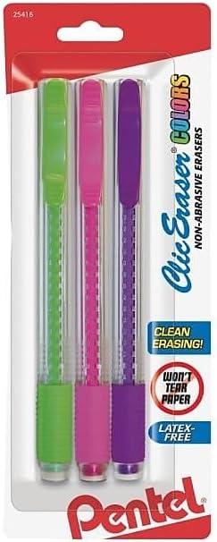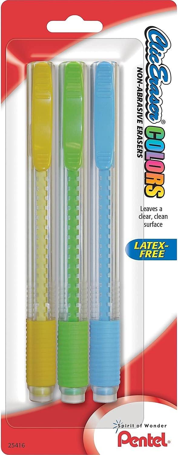 Pentel Clic Retractable Eraser with Grip, 3 Pack(Assorted)