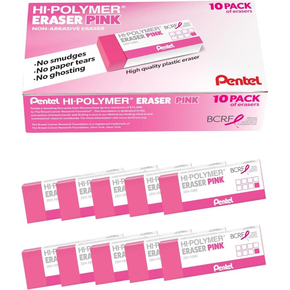 Pentel Hi-Polymer Pink Block Eraser, 10-Ct Box – BCRF Pink Ribbon (ZEH10PC10-BC)