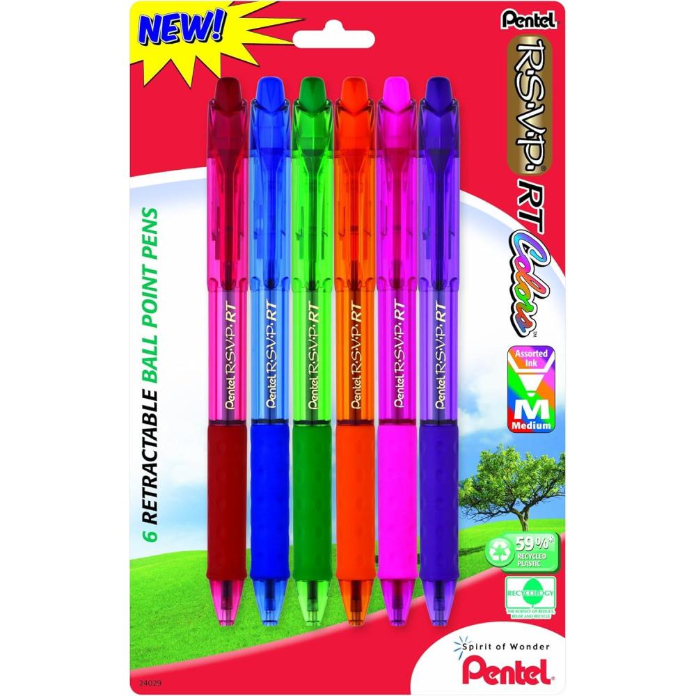 Pentel R.S.V.P. RT Colors New Retractable Ballpoint Pen, Medium Line, Blue Ink, 6 Pack (BK93CRBP6C)(Assorted 3)