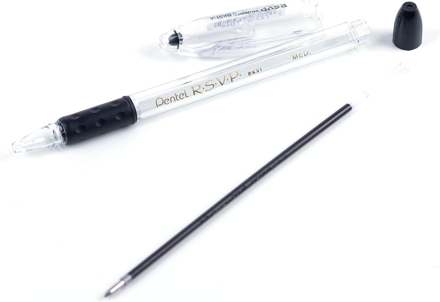 The Pentel RSVP ballpoint pen is a sturdy, well-balanced pen. This capped pen is designed for extended periods of use. The exclusive ComfortZone, latex-free grip is designed to reduce writing fatigue. The transparent barrel allows you to see the ink supply. Durable tip delivers a consistent line without skipping. The 0.7mm tip (BK90) writes fine lines; 1.0mm (BK91) writes medium lines. The long barrel holds more ink than the competition and can write for almost a mile! Select the BKL7 (fine) or BKL10 (medium) refills, which are available in a variety of colors.